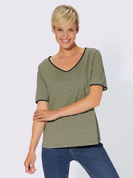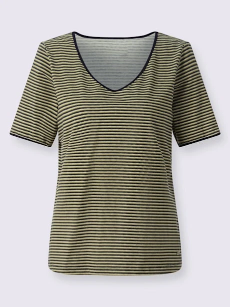 T-shirt rayé au motif losanges sportif. Joli passepoil uni à l’encolure en V arrondie et aux finitions des manches courtes.