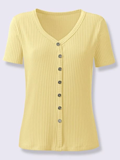 T-shirt confortable en qualité côtelée et extensible pour une grande liberté de mouvement ! Encolure en V et patte de boutonnage décorative sur toute la longueur avec boutons contrastés.