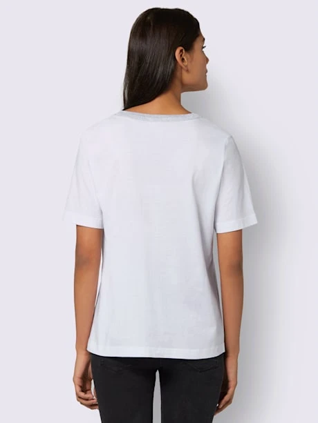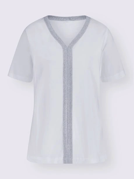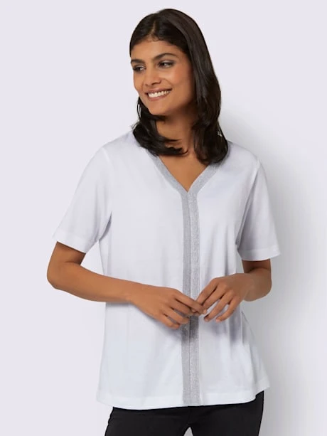 T-shirt à manches courtes avec superbe ruban brillant le long de l’encolure en V arrondie, devant et à l’ourlet.