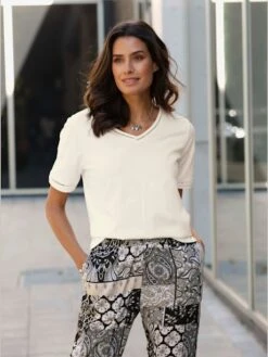Un T-shirt avec un petit plus. Encolure en V et bas des manches rehaussĂ©s d’une jolie dentelle. Doux au toucher et agrĂ©able sur la peau. En achetant ce vĂŞtement, vous soutenez l’initiative « Cotton made in Africa ».