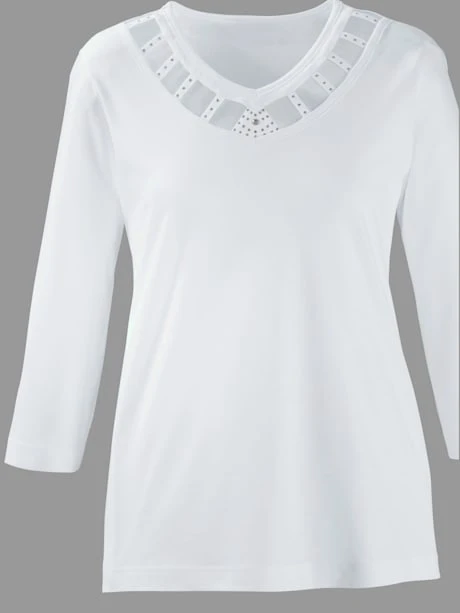 T-shirt avec découpes et petites pierres fantaisie à l’encolure. Manches 3/4.