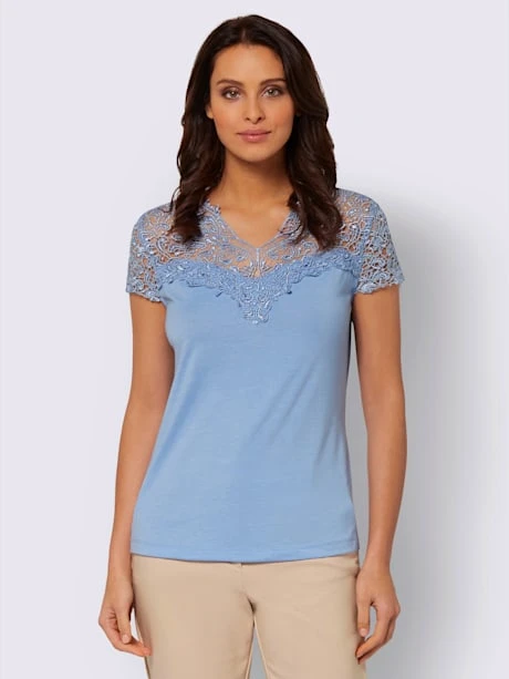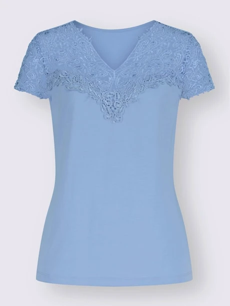Ce T-shirt séduit par sa fine dentelle transparente devant et aux manches ! Encolure en V.