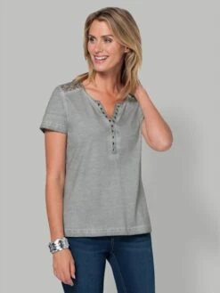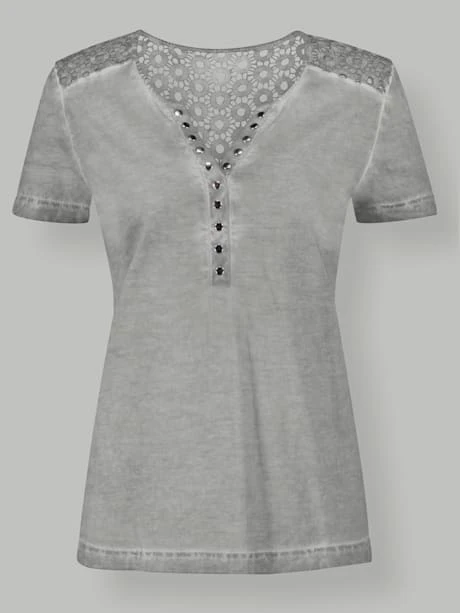 Plus qu`un simple T-shirt, une de vos pièces favorites ! Procédé effet délavé avec coutures éclaircies. Dentelle en filigrane transparente aux épaules et en haut du dos. Col rond avec petit V et patte de boutonnage fantaisie.