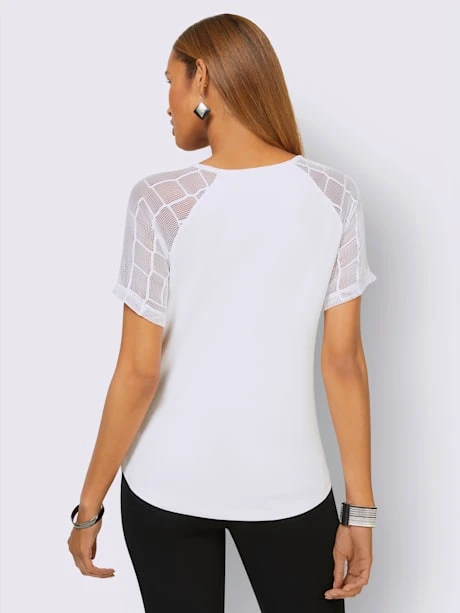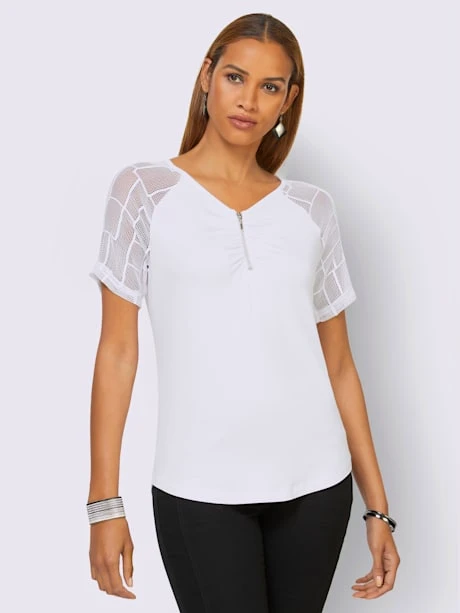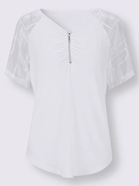 T-shirt avec dentelle moderne au style graphique aux épaules et manches courtes. Encolure en V se prolongeant par une glissière avec fronces flatteuses. Ourlet arrondi.