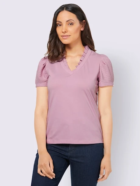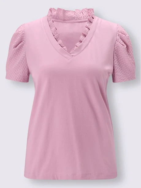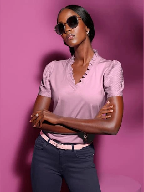 Compliments garantis ! T-shirt séduisant avec bordure volantée à l’intérieur de l’encolure en V et manches bouffantes ultra tendance.