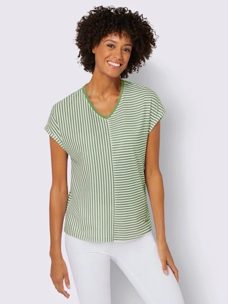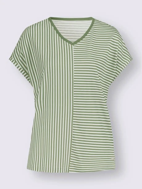 T-shirt décontracté avec mélange tendance de rayures verticales et horizontales devant. Encolure en V passepoilée et mancherons. Mélange de matières doux agréable à porter.