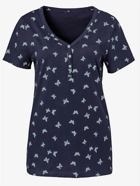 Avec ce T-shirt entièrement imprimé, vous serez à la pointe de la mode : Papillons ! Encolure en V et patte de boutonnage courte.