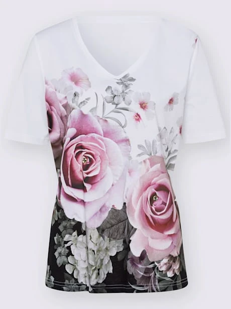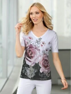 T-shirt au superbe motif floral orné de petites pierres en cristal fantaisie sur les pétales de rose pour un charme incomparable. Encolure en V arrondie légèrement plus large. Dos uni.