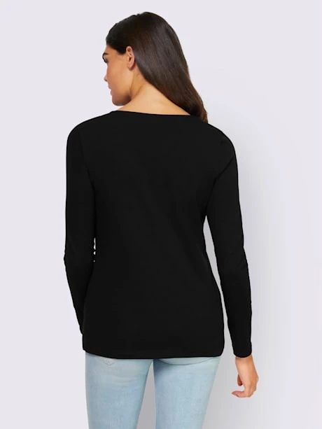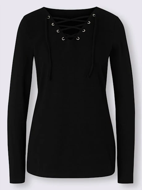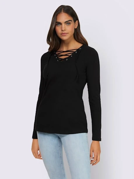 T-shirt ultra-tendance encolure en V à œillets et laçage décoratif. Légèrement cintré avec manches longues. Qualité douce et extensible.