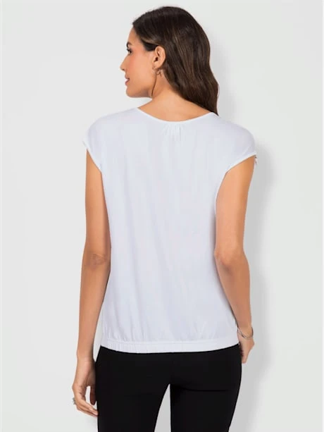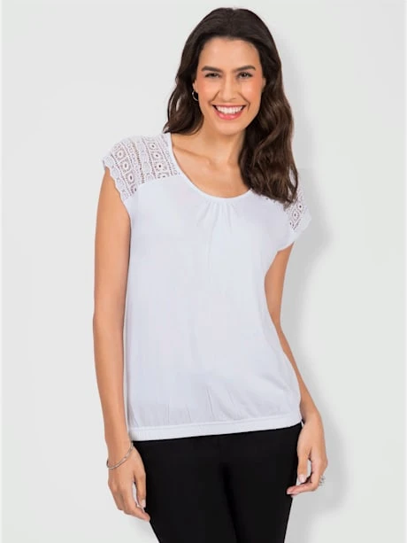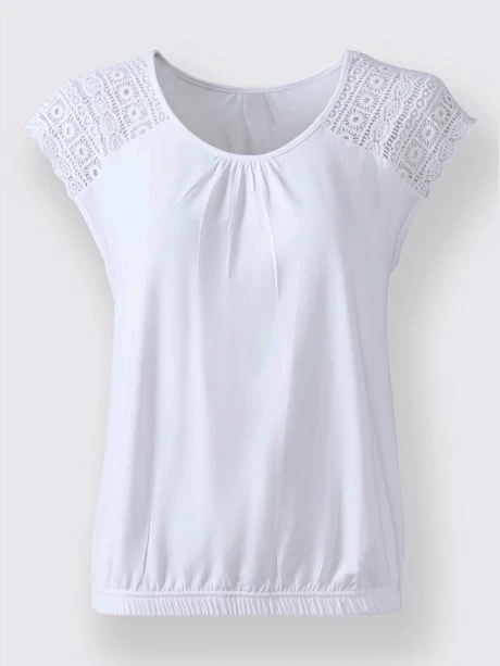 L’empiècement en dentelle sur les épaules dépassantes attire tous les regards sur ce T-shirt en qualité douce et fluide. Les plis à l’encolure ronde et le lien élastiqué à la base lui confèrent une largeur avantageuse.