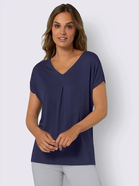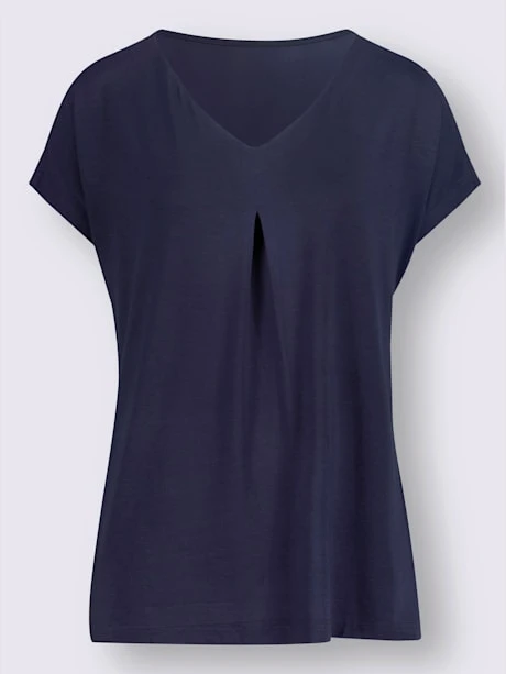 Très beau T-shirt ! Encolure en V affinante, mancherons et plis devant pour plus d’ampleur et un tombé avantageux.
