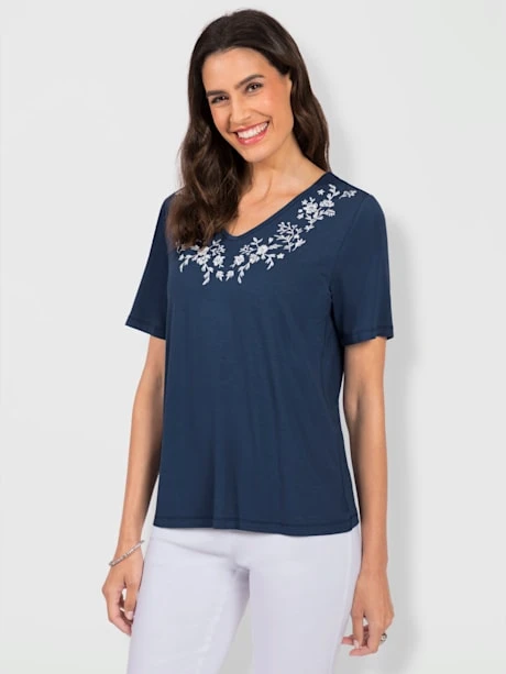 Le T-shirt est rehaussé de broderies fleuries autour de l’encolure en V passepoilée, ce qui le rend très attrayant. Tissu merveilleusement doux et fluide. Viscose en matière ECOVERO signée Lenzing.